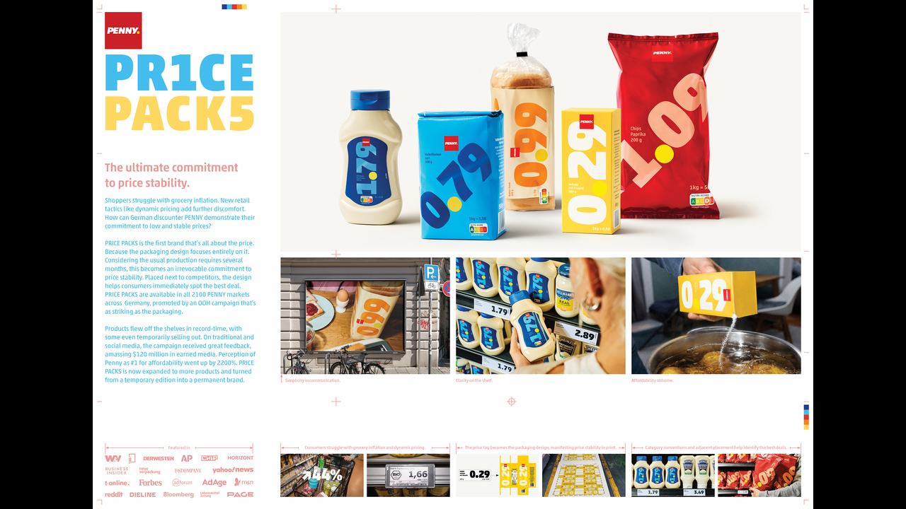 Placed next to competitors, the design helps consumers immediately spot the best prices. PRICE PACKS are available in all 2100 Penny markets in Germany, promoted by an OOH campaign as striking as the packaging. RESULTS: Products flew off the shelves in record-time, with some temporary selling out during launch week. On traditional and social media, the campaign received raving reviews, earning $120 million in free media.